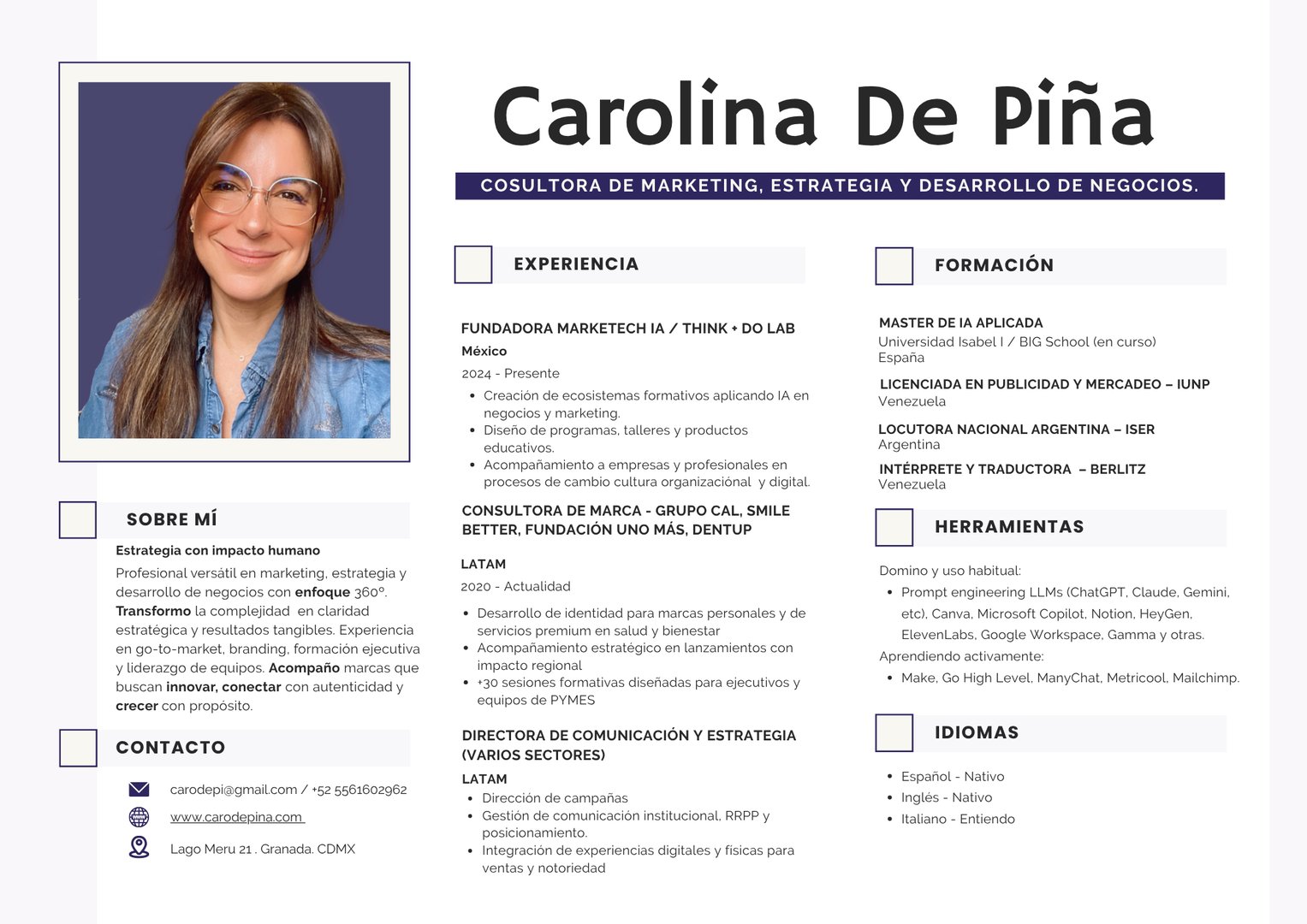Desde mi trayectoria en marketing, estrategia y desarrollo de negocios, y una pasión por la innovación, he creado Think+Do IA lab para ser el puente entre la complejidad de la IA y su implementación práctica y efectiva.